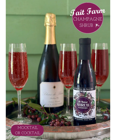 A champagne toast is a tradition of celebration. At Tait Farm, we add a splash of Shrub to the champagne or prosecco for a boost of fruity flavor. For a non-alcoholic version skip the alcohol altogether so that everyone can a rasie a glass of good cheer.