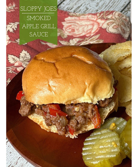 Saute the pepper and onion in the oil until translucent. Add the ground meat; breaking it up and stirring until it is no longer pink. Add the Smoked Apple Grill Sauce. Lower the heat and simmer for 10 - 15 minutes. Serve on buns. 4-6 servings